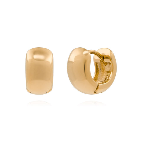 A bolder more confident hoop. With its thicker outline and brilliant gold finish, these earrings make use of stronger lines and higher light reflectivity to ensure maximum statement with modest size.
