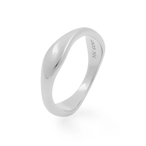 The Symmetry Stackable Wave Ring, with its gracefully undulating curve, nests perfectly with others to enhance their collective allure. Worn in pairs, its flowing waves create a striking harmony of elegance and strength.