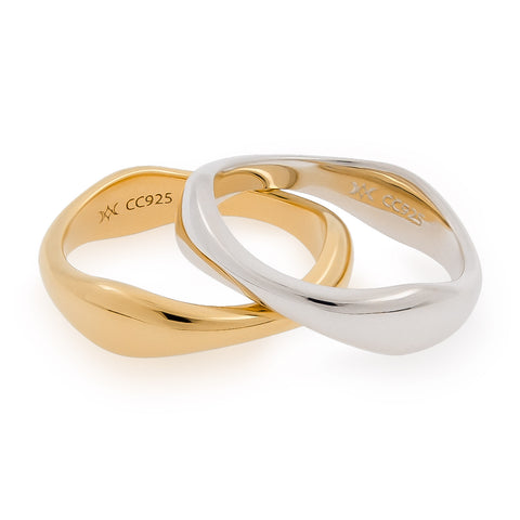The Symmetry Stackable Wave Ring, with its gracefully undulating curve, nests perfectly with others to enhance their collective allure. Worn in pairs, its flowing waves create a striking harmony of elegance and strength.